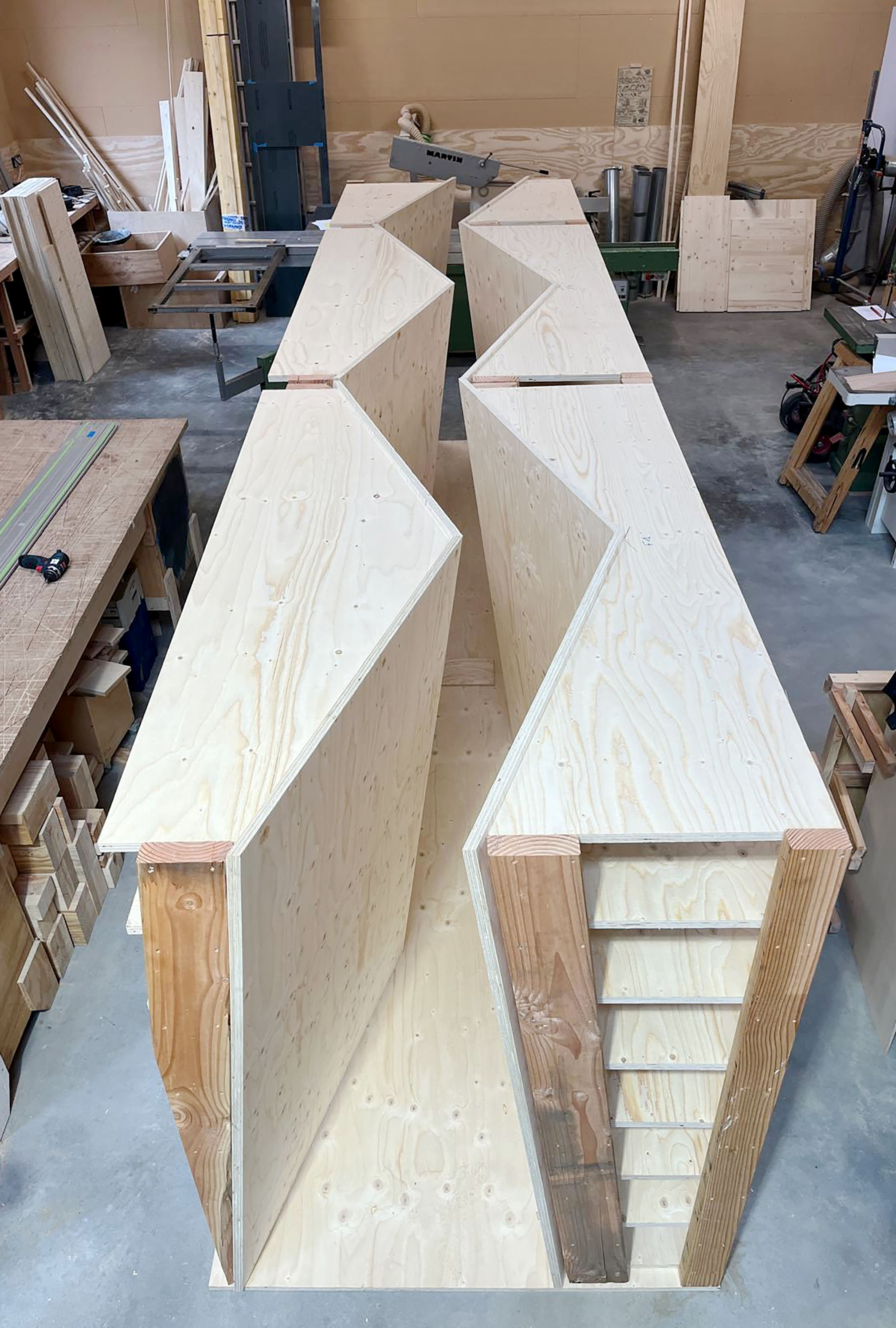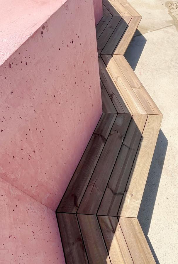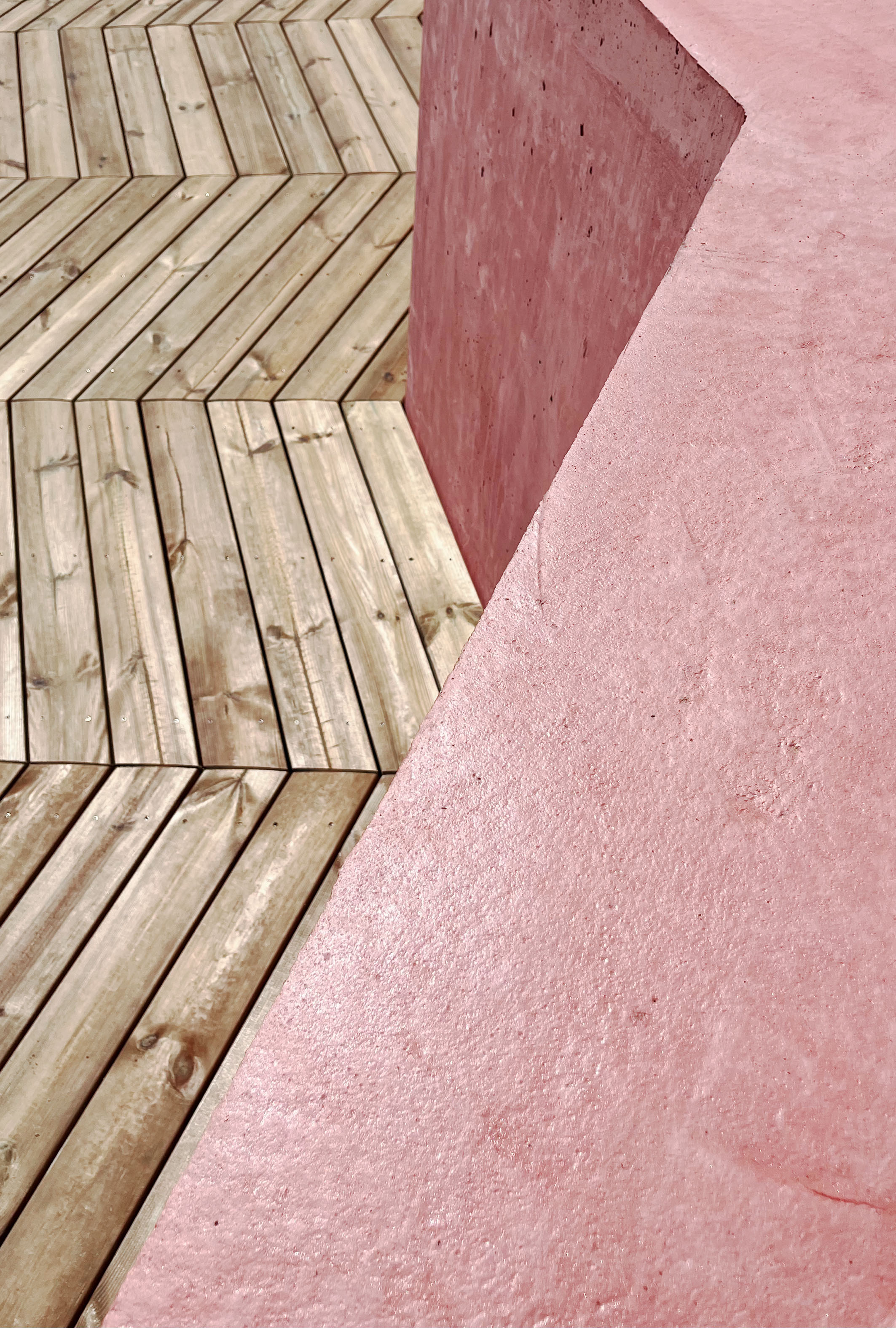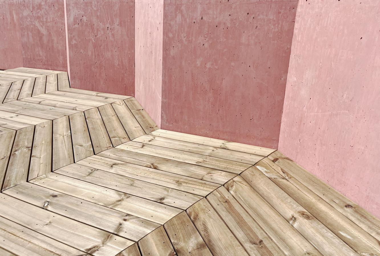 Le Métafort est un objet composé d'une estrade - platelage en pin, traversée par un paravent massif - mur en béton teinté. Dessinant un zig-zag orienté vers le Fort à l'ouest, le mur sépare et abrite deux usages propres à l'installation : Au sud, une surface scénique est ouverte sur l'esplanade minérale, et au nord un banc s'adresse à une surface enherbée.